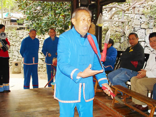 三棒鼓,是以拋三根棒和敲鑼打鼓得名,是土家山寨到處可見的一項(xiàng)以打擊樂器、口頭文學(xué)、表演技藝合為一體的文體活動形式。 打三棒鼓通常由三至五人組成,師傅擊鼓唱詞,一人打鑼,一人;ò、花刀。由一人表演,將鼓架擺在前面鼓架上,將鑼掛在鼓架下面,用細(xì)繩系著鑼棒套在腳板上,表演時,口唱詞、手打鼓、腳踩鑼,鑼鼓節(jié)拍是按拋花棒、花刀速度的需要而定。三棒鼓的唱詞是五言四句重復(fù)半句組成。即五字一句,四句為一節(jié)。每小節(jié)的第四句要重復(fù)半句。每一小節(jié)擊響鑼鼓四遍。前三句是每唱完擊三響,最后一句唱完即每小節(jié)結(jié)束時擊響十下。例如唱:"學(xué)打三棒鼓",打"鏘鏘鏘";唱"學(xué)又學(xué)得苦",打"鏘鏘鏘";唱"三歲學(xué)到一十五",打"鏘鏘鏘";唱"學(xué)起呀,學(xué)起走江湖",打"鏘鏘鏘、鏘、鏘、鏘鏘鏘鏘鏘-鏘"。這一小節(jié),每唱一字為一拍,"鏘"為鑼鼓同鳴聲,每聲占一拍,標(biāo)點(diǎn)符號也占一拍。每拍的快慢取決于花棒下落的速度,任何一個花棒下落一次均為一拍。因此,如果花棒拋得低,下落的頻率就快,每拍所占時間就短,反之,花棒拋得高,每拍占的時間就長。三棒鼓的第二句和第四句都要求壓韻,一句和三句可壓可不壓. 打三棒鼓的技巧性很強(qiáng),思想要高度集中,拋刀拋棒用力要適度,動作要敏捷準(zhǔn)確,稍有疏忽大意,不但表演失敗,還會被刀劃破手腳或誤傷他人。因此,凡是學(xué)打三棒鼓者,均需經(jīng)常練習(xí)飛拋接技術(shù),做到閉目均能拋接刀棒。因此,土家族青少年經(jīng)常用三個卵石練習(xí)拋接技術(shù),久而久之,熟能生巧,不但會拋棒,而且能拋刀。 打三棒鼓的鑼鼓曲牌不變,但唱詞多種多樣,除了固定的《十二月花》等唱詞外,均為即興編詞隨口而唱,唱三棒鼓歌的人,都是腦筋靈活、口才伶俐者。 |