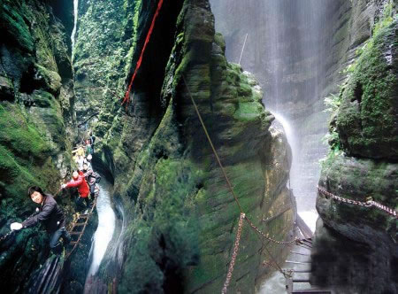 坐龍峽圖片 坐龍峽風(fēng)景區(qū)位于古丈縣河西鎮(zhèn),與“芙蓉鎮(zhèn)”--王村一水之隔。經(jīng)由300萬(wàn)年大自然的風(fēng)吹、水蝕而成,一直隱逸于湘西茫茫十萬(wàn)群山之中。它長(zhǎng)約3500米,最大高差達(dá)300余米;寬處不足丈余,窄處僅容一人通過;谷內(nèi)絕壁縱疊,溪瀑橫懸,崖樹斜逸,異草遍坡。