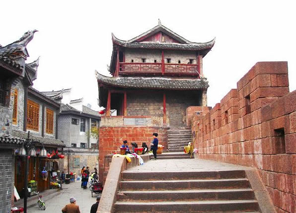 到清朝,古城的軍事地位日顯重要,先后在這里設(shè)鳳凰廳、鎮(zhèn)竿鎮(zhèn)辰沅永靖兵備道治所,古城的建設(shè)也得到加強(qiáng)?滴跷迨哪辏1715年)遂將磚城改建為石城,北門定名為“壁輝門”,一直保存至今。北門古城樓采用本地紅砂條石筑砌,做工考究,精鉆細(xì)琢。城門呈一半月拱,有兩扇鐵皮包裹。圓頭大鐵釘密鉚其上的大門。城樓用青磚砌筑,重檐歇山頂,穿斗式木結(jié)構(gòu),石座卷頂。城樓對(duì)外一面開槍眼兩層,每層4個(gè),能控制防御城門外一百八十度平面的范圍。北門城樓與東門城樓之間城墻相連,前臨清澈的沱江,既有軍事防御作用,又有城市防洪功能,形成古城一道堅(jiān)固的屏障,雖幾經(jīng)戰(zhàn)火,仍巍峨聳立于沱江河岸。