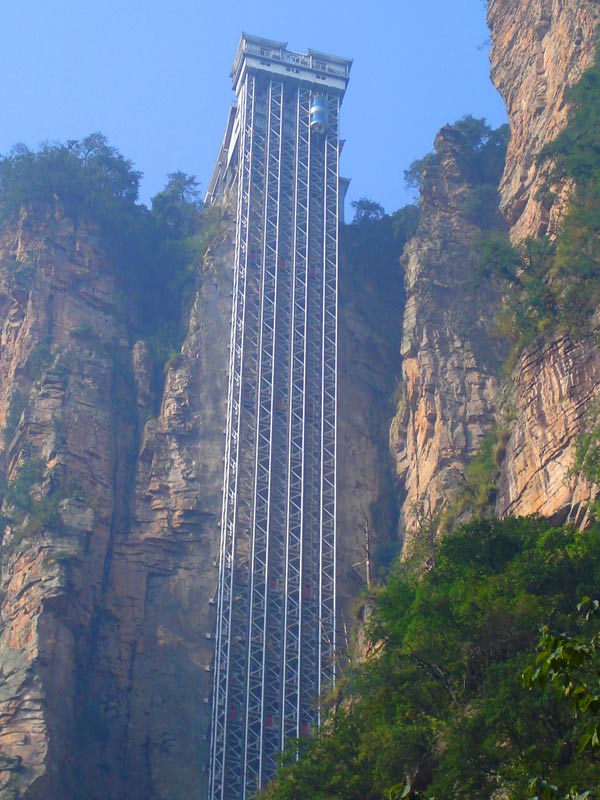 百龍?zhí)焯,垂直高?35米,運行高度326米,由154米山體內(nèi)堅井和172米貼山鋼結(jié)構(gòu)井架等組成,采用三臺雙層全暴露觀光電梯并列分體運行,每臺次載客50人次,運行速度3米/秒,三臺同時運行每小時往返量達4000人次。百龍?zhí)焯莸男藿▽崿F(xiàn)“山上游,山下住”的目標(biāo),提供了交通保障,將袁家界天下第一橋、迷魂臺、天懸白練以及烏龍寨、楊家界等絕世美景從幕后推向了前臺,并將天子山、袁家界、金鞭溪等精品旅游線路連為一體,解決了多年困擾景區(qū)的交通瓶頸問題。