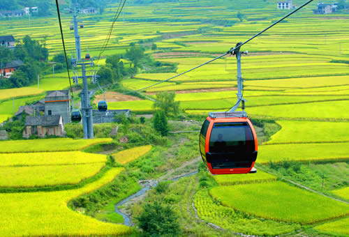 天門山索道途經(jīng)的美麗田園 天門山索道最大的亮點就是它的爬坡面支架的設計 ,這個支架共有壓索輪96個,托索輪16個,它綜合了現(xiàn)代物理學、現(xiàn)代工程學、現(xiàn)代制造業(yè)中最先進的理論和成果,應用了世界最先進的索道技術,從而使這段索道總給人一種蕩氣回腸、氣勢沖天的感覺。