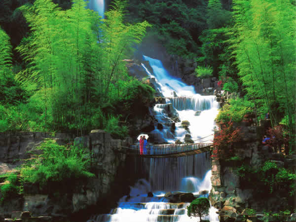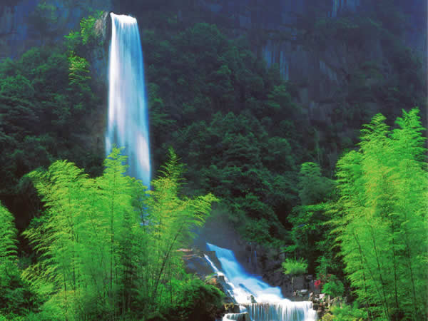 寶峰湖瀑布 湖中有兩座疊翠小島,近岸奇峰屹立,峰回水轉。泛舟漫游,只見一湖綠水半湖倒影,充滿詩情畫意!霸铺萑f丈上天臺,高峽平湖一鑒開,王母瑤池金扶,浣沙仙女下凡來”游寶峰湖,你就會欣賞到這樣的詩情畫意。群峰擁抱的寶峰湖,長約2.,5公里,湖猶如一面寶鏡,四面青山,一泓碧水,蕩槳溫游,格外愜意。坐在船上,環(huán)顧四周,千山聳翠,俯視水中,倒影慢移,碧水照相館得群峰綠,人面桃花水映紅。真是靜極了,美極了!韓劇《九天洞》拍攝的湖水就是寶峰湖。