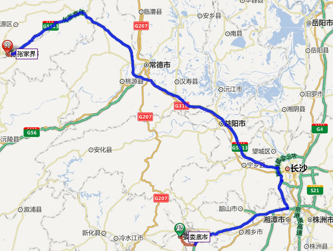 婁底去張家界自駕車線路圖: