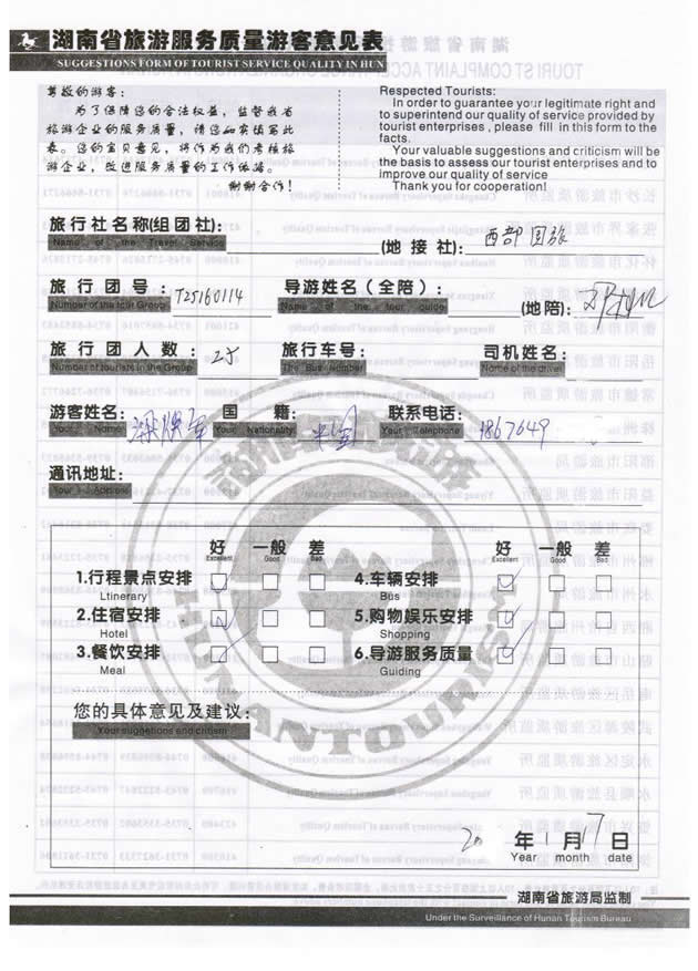 1月份,廣東梁女士一行25位貴賓與湖南西部(張家界)中國國際旅行社工作人員——張群取得聯(lián)系,經(jīng)過商談,雙方達成協(xié)議并簽訂旅游合同,于1月14日抵達張家界,開始張家界之旅。此次行程是由我社優(yōu)秀導(dǎo)游——鄧桃紅負責(zé)旅游接待工作,鄧導(dǎo)在旅游過程中講解詳細,客人也很滿意。同時也感謝梁女士一行貴賓選擇湖南西部(張家界)中國國際旅行社,以及您對湖南西部國旅的信任與支持。我們會繼續(xù)努力,做好旅游接待工作。期待下一次與您的合作,祝您愉快!