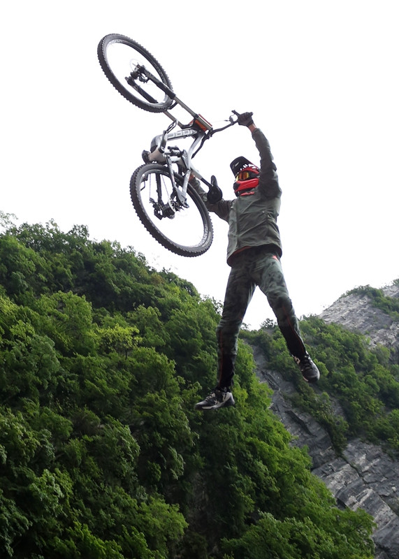 自行車運(yùn)動包含了公路自行車和山地自行車,而山地自行車又包含眾多種類,BMX小輪車,攀爬車, XC(越野山地車),AM(全山地車山地車),DH(山地速降)等。其中,DH屬于山地自行車運(yùn)動中最重型車種,騎行最具挑戰(zhàn)性、觀賞性、技巧性。DH山地速降最典型的賽道是在山上,樹林中,天門山999級臺階速降騎行對于DH山地車速降來說更具挑戰(zhàn)性。整條臺階沒有平坦路面,一路顛簸下山,中途沒有可調(diào)整的機(jī)會,要求車手有極高的控車能力,天梯平均陡度39度以上,僅是站立在臺階上就已經(jīng)感覺一覽眾山小了,站在自行車上更是陡峭,天梯一路筆直下山,加上其坡度,車手的速度可想而知,也更是車手對車子的控制力的一個新挑戰(zhàn)。賽道中還加設(shè)了跳臺,車手在應(yīng)付如此高難度臺階路段同時,還要進(jìn)行跳躍,更是難上加難。天門山天梯速降賽被業(yè)界譽(yù)為“世界上難度最大,對選手技術(shù)要求最高的速降賽”,其極高的難度和無與倫比的觀賞性成為世界范圍內(nèi)最精彩最具挑戰(zhàn)性的自行車速降比賽之一。
