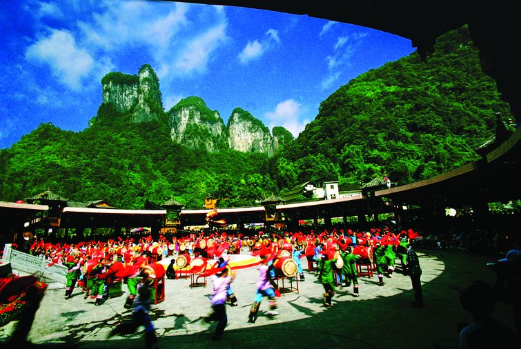吉首市德夯風(fēng)景區(qū)地處云貴高原邊緣,位于湘西土家族苗族自治州首府吉首市西郊,距吉首市24公里。德夯旅游區(qū)以矮寨為中心,東到堂樂洞、西到大龍洞,南從武山、蓮臺山開始,北到流紗瀑布(全國落差最高的流紗瀑布和瀑布群),小龍洞,總面積約190平方公里。自矮寨鎮(zhèn)洞溪上行4公里至德夯苗寨,沿岸筒車、水輾、古渡、小舟,伴以苗家吊腳樓,一派田園詩情。九龍溪穿寨而過,四周山色清幽,懸崖如削......在青山綠水間,點綴著一幢幢灰瓦石基吊腳樓,一條條光滑的石板路,一座座精巧的石拱橋,一群群赤足紅裝的浣紗苗女。還有那古老的石碾和筒車,在水力的帶動下,咕咕嚕嚕、咿咿呀呀,不知疲倦地旋轉(zhuǎn)著,一派田園詩情,這就是德夯苗寨。由于這里是純苗區(qū),苗族人民的風(fēng)俗習(xí)慣對德夯影響很大,苗族人民的四月八、跳鼓舞、三月三歌會、趕秋、接龍、推牛以及苗嶺情歌,無不吸引著中外游客。因此,古樸優(yōu)雅的苗族風(fēng)情又成為德夯人為景觀的特色。